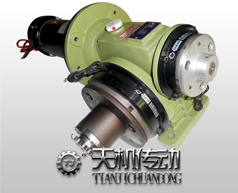 天機傳動該標準型蝸輪減速機電磁離合剎車組合,由鑄鐵蝸輪減速機、TJ-B2型單片電磁制動器(下稱制動器)、TJ-A2型內軸承式電磁離合器(下稱離合器)組成。離合器裝置于減速機的輸出端,制動器裝置于減速機的輸入端右側,輸入端左側與電機連接。