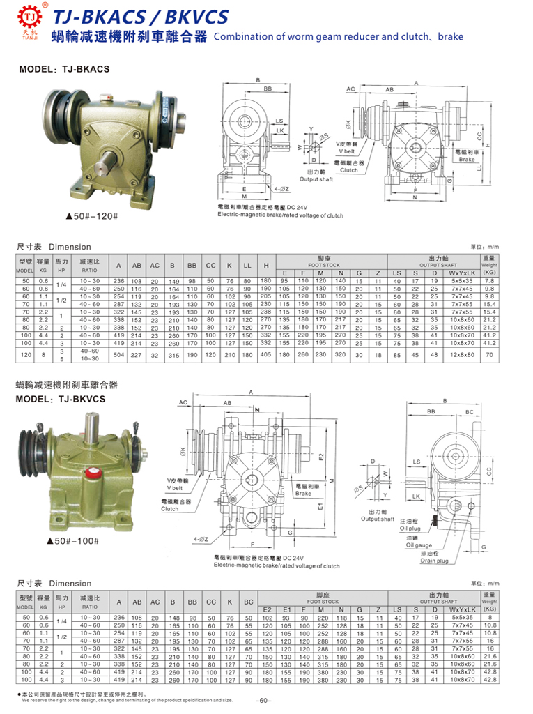 天機傳動該型離合剎車減速機(BKDCS型)由鑄鐵式蝸輪蝸桿減速機與一個摩擦式電磁離合器(下稱離合器)附V型皮帶輪,可雙槽或者單槽,及一個電磁制動器(下稱制動器)組成。離合器與制動器各裝置在減速機的輸入兩端,當一邊通電的時候,另一邊就要斷電,注意:兩個不能同時電。