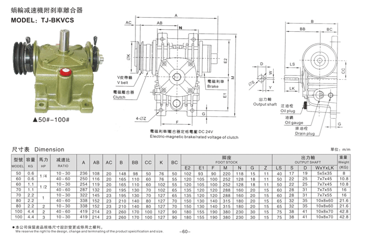電磁離合剎車減速機適合匹配規格2.5KG、5KG、10KG的電磁離合器與制動器,而減速機傳動比則有10、20、30、40、50、60共6個,減速機中心距有50、60、70、80、100共5個(型號)。安裝尺寸規格如下: