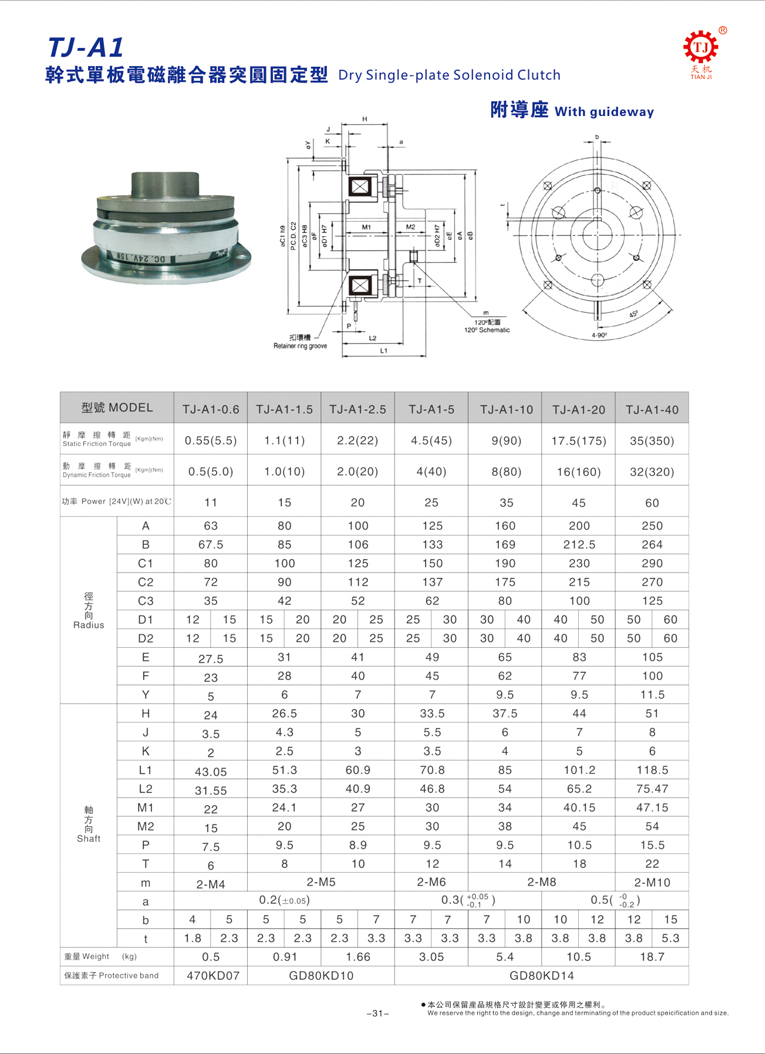 天機傳動片式摩擦電磁離合器附導座TJ-A1型由銜鐵(電樞板)、定子、轉子、板型彈簧片、磁性線圈、來令片、鋁導座等元件構成,統一使用DC24V,標準規格0.6-40KG。